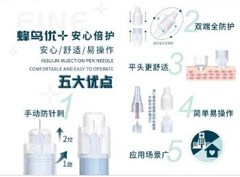 本次博覽會上貝普還重磅發(fā)布了新品全新一代防針刺胰島素針——蜂鳥優(yōu)+,既延續(xù)了蜂鳥針不折不漏硬針尖的特點,還在此基礎上安心防針刺。其中手動防針刺、雙端防護功能讓針尖在使用中和使用后360度防護。貝普專利的平頭設計極大減輕了患者在注射時候的不舒適感,去除了小針帽的設計讓使用步驟減少,方便了不少中老年患者。而目前市售最細的34G針尖讓胰島素的注射真正的做到了入肉幾乎無感。